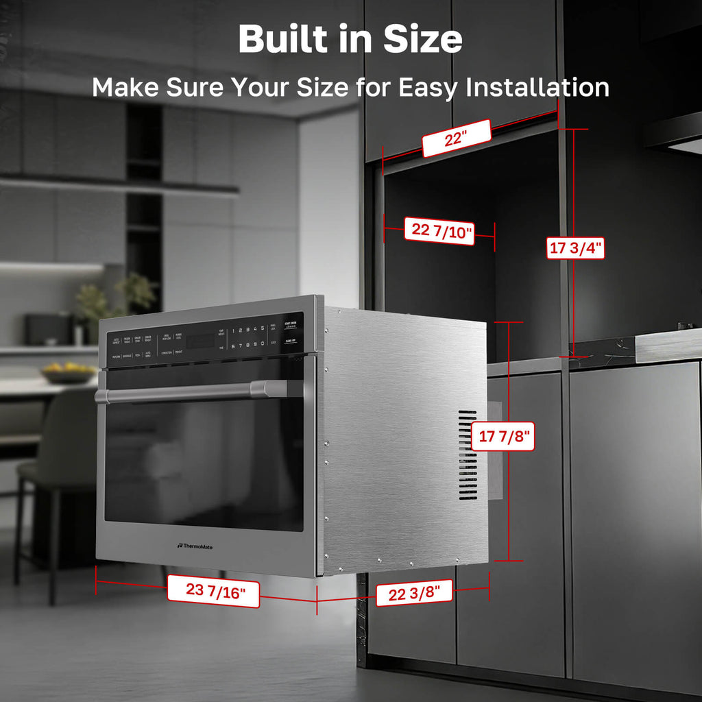 Conçu pour s'intégrer parfaitement aux cuisines modernes, ce four combiné four micro-ondes en acier inoxydable de 24 pouces est compact et puissant. Avec ses dimensions de 23,4" x 17,9" x 22,4" et sa finition élégante en acier inoxydable, il s'intègre parfaitement à vos meubles. Ses performances sont assurées par une puissance de 1750 W pour le gril, 1000 W pour le micro-ondes et 1700 W pour la convection.