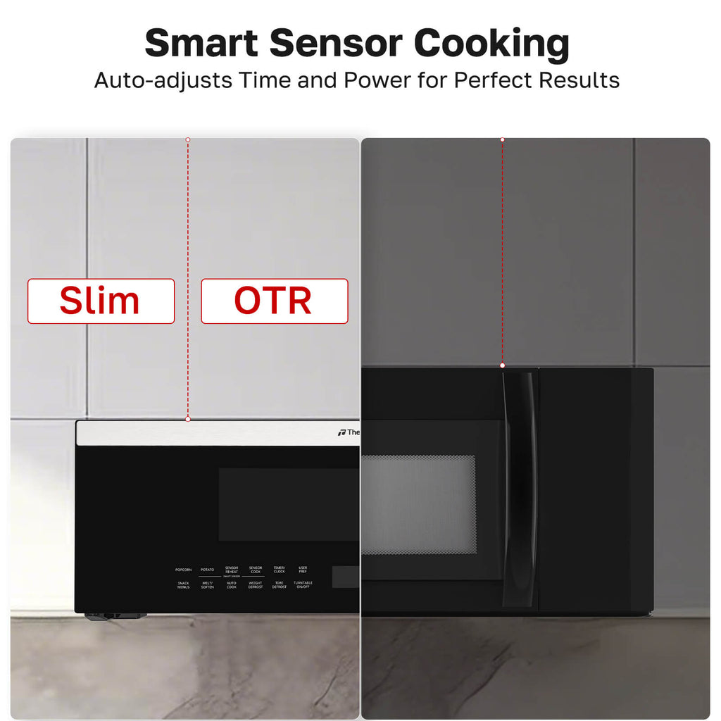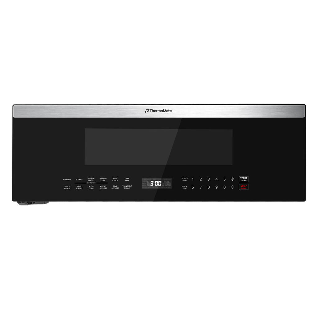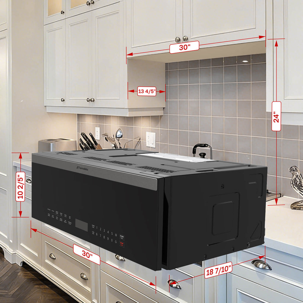 The ThermoMate 30-inch Low-Profile Over-the-Range Microwave is designed to fit seamlessly above your cooktop while taking up significantly less space than a traditional OTR microwave. Its slim 10.4-inch height fits in the same space as a standard range hood—freeing up valuable countertop room without sacrificing usable cooking capacity.