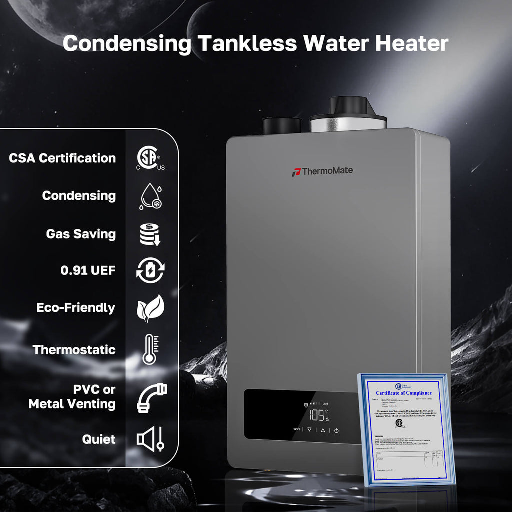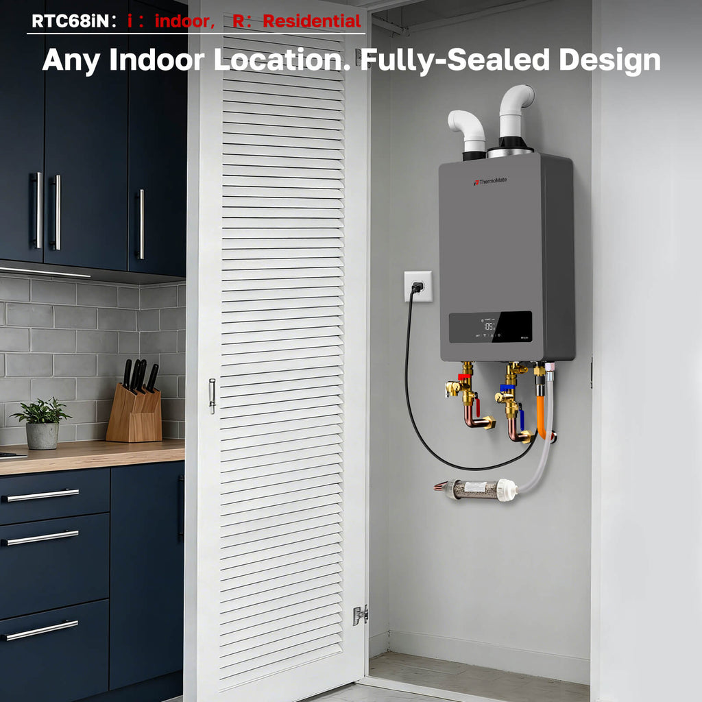 The ThermoMate RTC68iN Condensing Tankless Water Heater delivers powerful whole-house performance with industry-leading 0.91 UEF efficiency. Designed for North American homes, this high-output 163,000 BTU natural gas unit provides continuous, on-demand hot water while reducing annual energy costs.